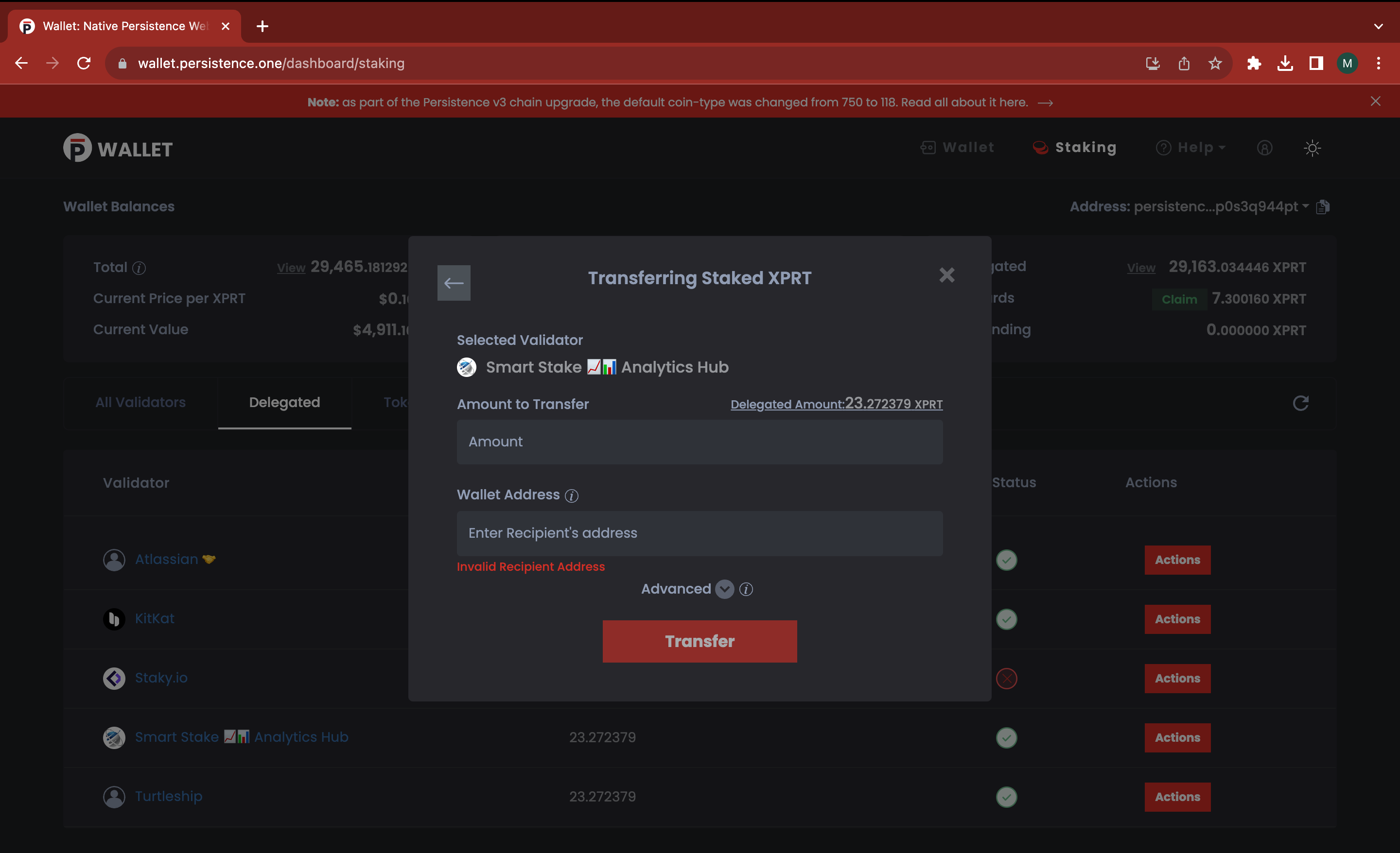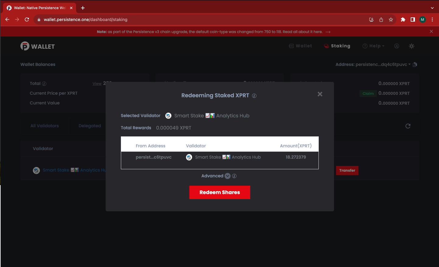⚠️ Warning: Note: If your validator doesn't have enough capacity, ask your validator to increase it or redelegate your staked/delegated tokens to a validator which has enough capacity for your tokens.