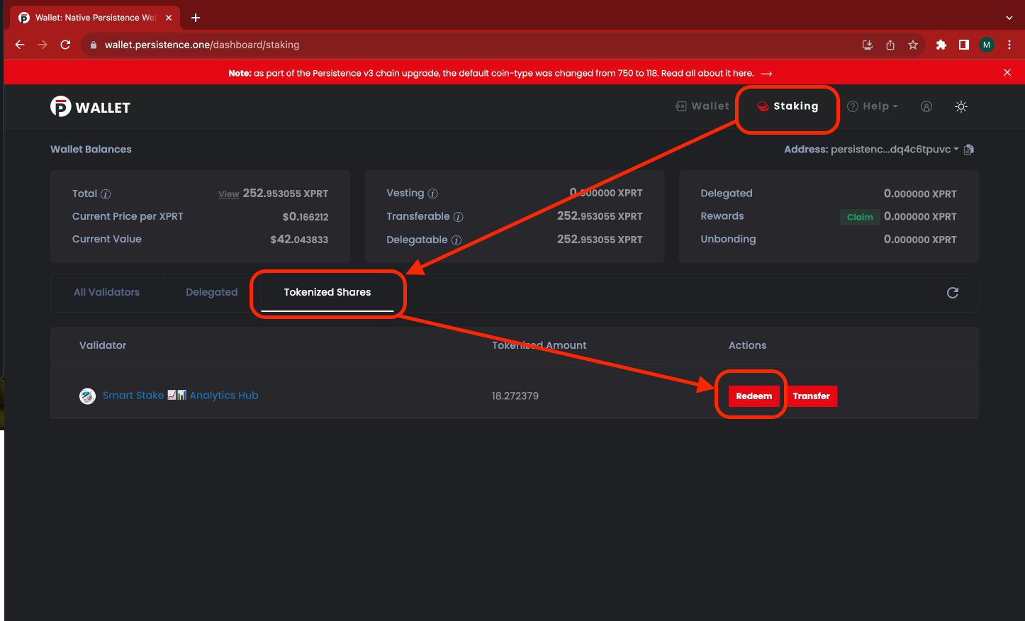I. Go to 'Staking' tab, select 'Tokenized Shares' & click on 'Redeem'